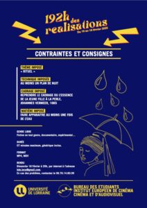 - les courts-métrages réalisés seront projetés le 22 février en amphi Déléage – Campus LSH de Nancy en présence des équipes ;