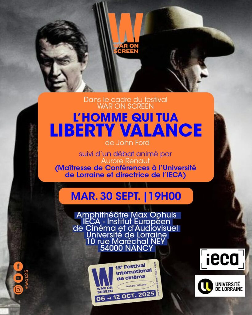 Dans le cadre de la 13ème édition du Festival International de cinéma War on Screen une projection « hors-les-murs » est organisée à l’IECA. Le western crépusculaire L’Homme qui tua Liberty Valance(1962) de John Ford, sera animé par Aurore Renaut, directrice de l’IECA et Maîtresse de Conférences.