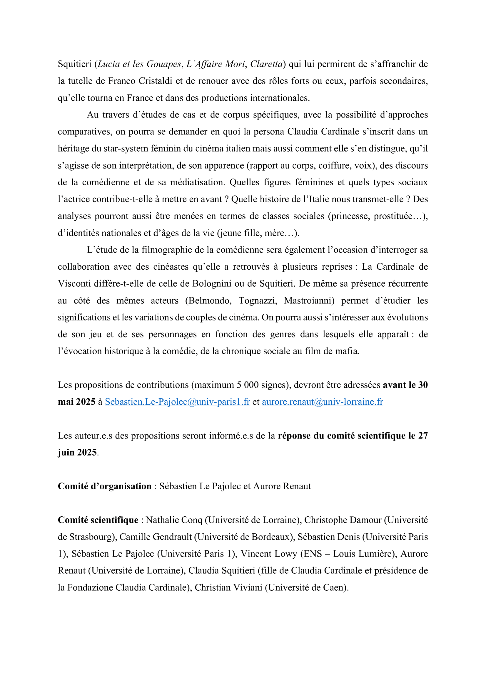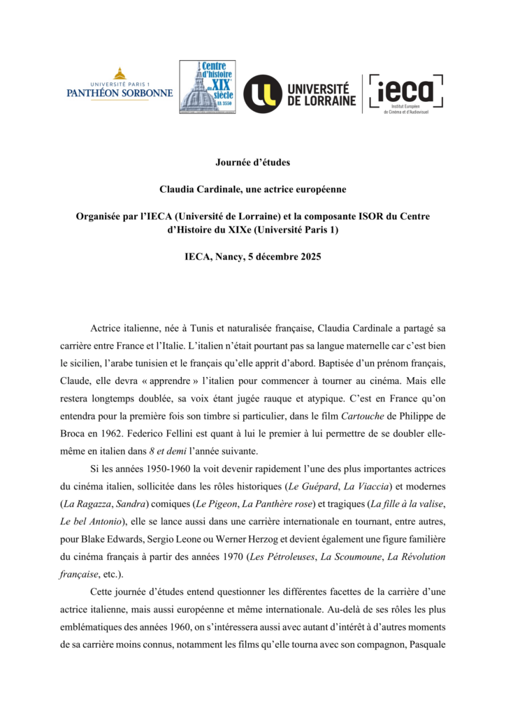 L’IECA et la composante ISOR du Centre d’Histoire du XIXe (Université Paris 1) organisent une journée d’études consacrée à Claudia Cardinale, figure emblématique du cinéma international, qui aura lieu le 5 décembre 2025 📍 l’IECA, 10 rue Michel Ney, 54000 Nancy.