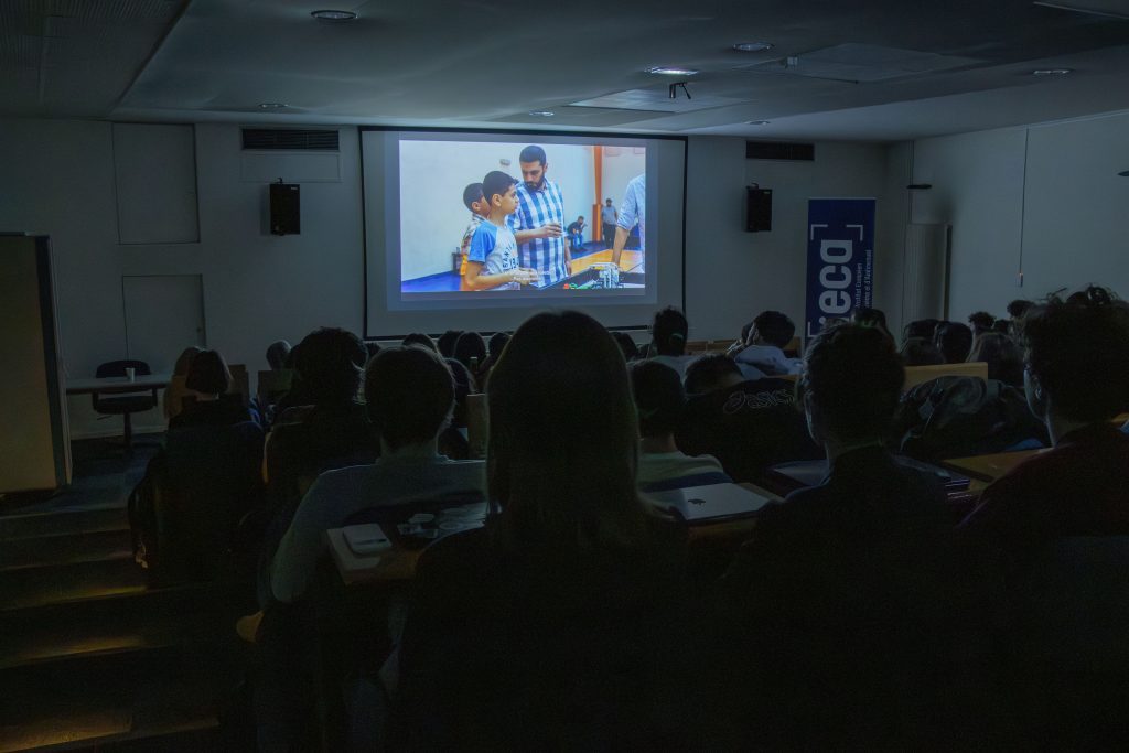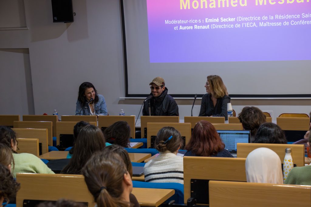 Éminé Seker : « Le centre de Résidence est basé en Lorraine, à Saint-Quirin. […] On accueille depuis 2012 des cinéastes en documentaire, comme Mohamed, en prise de vue réelle ou en animation. On a des appels à projets dont Mohamed a été l’un des lauréats, 2022. Avec un projet qui ressemble un peu au film final mais pas tout à fait. […] On l’a accueilli très en amont de l’écriture. Les profils qui candidatent c’est vous (les étudiants) dans quelques années, voire même à la sortie de l’IECA. Donc ce sont des premiers, voire deuxième film. […] Et cette année on a lancé l’appel à projet pour 2026. […] C’est court-métrage, documentaire, prise de vue réelle et animation. Pour la première fois on a décidé de thématiser le thème, et cette année c’est le bonheur. »